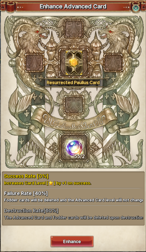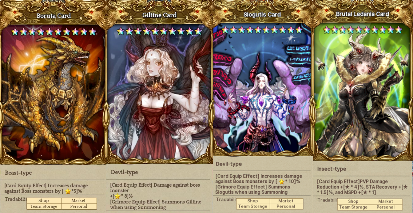 Para você conseguir a melhor carta PvE do jogo que é o Slogutis, até o momento, você precisará do Boruta Card. Upando ele pro 10 e juntando 10 Glimpse of Chaos que dropa na raid Demonic Sanctuary Hard ( é chato pra carmba dropar lá, melhor comprar no market, que direto vem no gacha ), mais outra lendária nível 10, ao consumir o Glimpse of Chaos abrirá um menu, onde você posiciona esses itens e conseguirá sua Giltine. E por aí vai. Mas vamos por partes.