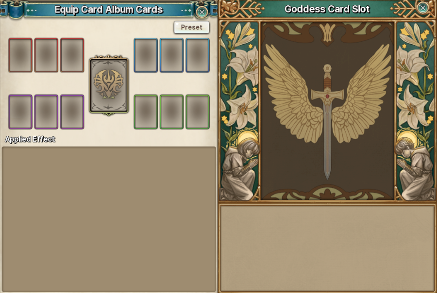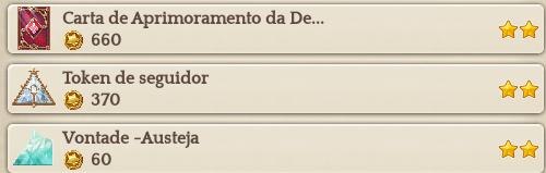 Aqui posicionaremos nossos itens. O Berlob ( item no slot inferior ) você pode comprar em qualquer loja da Deusa, na aba “Material”. O que importa mesmo, são as cartas Leticia. Você pode conseguir essas cartas através de eventos, gachas ou comprando no market. Elas não são caras. Vale muito a pena.