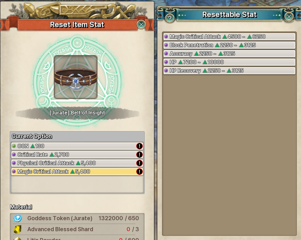 Caso você queira roletar algum atributo da Spaulder ou Belt, você pode ir no barraco da Mestre Piromante em Klaipeda, ou clicar no “ Menu “ embaixo do minimapa e ir em “ Reset Item Stat “. Cobrando algumas shards e Powders, você conseguirá roletar apenas 1 stats daquele equipamento.