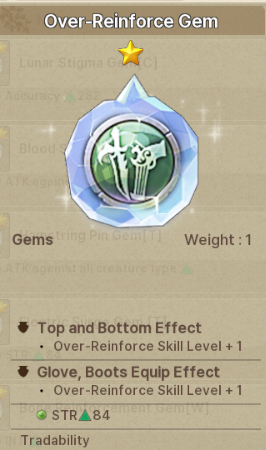 Nesse exemplo, temos a gema da habilidade “ Over-Reinforce, do Enchanter. Ela aumentará em 1 nível esta habilidade e também concederá algum atributo aleatório, no caso essa da imagem, irá aumentar em 84 pontos sua STR.
