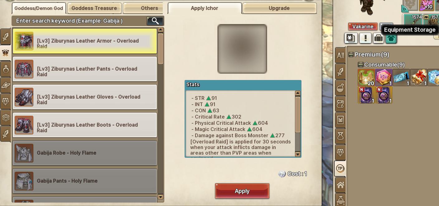 Armadura da Deusa. Ao utilizar este ticket, você poderá selecionar um “buff” que coloca nas suas 4 partes de armadura. Cada armadura da Deusa tem um efeito diferente. Por exemplo, Ziburynas vai favorecer habilidades de Instant Casting ( habilidades que não tem conjuração ou canalização ), Gabija vai favorecer habilidades de Casting, Dahlia melhora muito o dano das habilidades de Canalização e Austeja é o foco para quem joga de Healer.