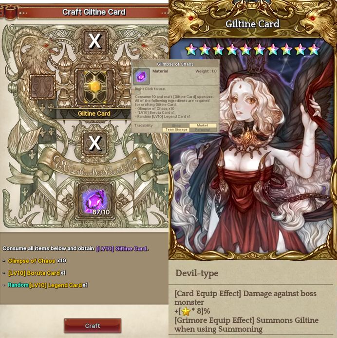Se você upou seu Boruta ( carta que indico fortemente upar primeiro ), você poderá evoluir ele para uma Giltine Card, como comentei anteriormente. Para isso, basta ter 10x Glimpse of Chaos ( opte por comprar no market ou ganhar no gacha. É mais fácil do que dropar ).