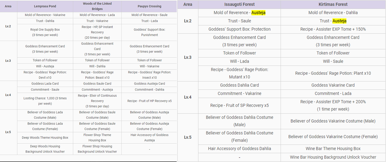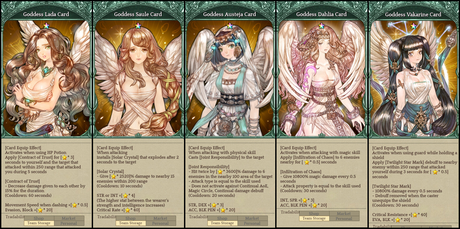 Como podemos ver, existem, na verdade, cinco Cartas de Deusas: Lada, Saule, Austeja, Dahlia e Vakarine. Apesar deste número, as cartas mais utilizadas são: Austeja (para a maioria dos DPS Físicos), Dahlia (para a maioria dos DPS Mágicos) e Vakarine (para os Curandeiros), mas há pessoas que continuam usando Lada ou Saule para outras situações ou preferências pessoais.