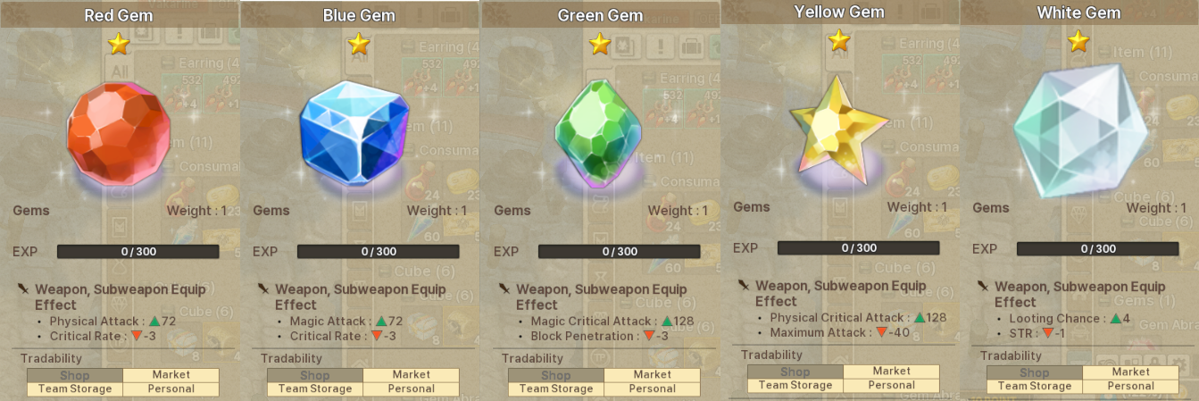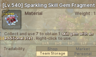Para conseguir essas gemas, temos diversas formas, como por exemplo, farmar a Sparkling, que juntando 7 e consumindo, vira uma gema aleatória com status aleatório. Esses fragmentos você consegue nos mapas do level 540+.