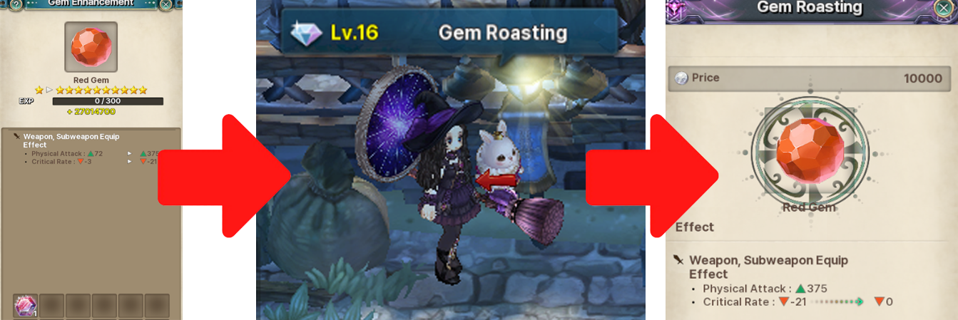 E para deixá-las no nível 10, ao aceitar o Popo Boost, você recebeu exatos 8 10-Star Gem Abrasive. Para aplicar nas suas gemas, basta sentar ( insert ) e apertar D, em “ Gem Enhancement “. Colocando sua gema no slot superior e o abrasive embaixo, é só confirmar que ela vai para o nível 10.