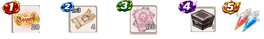 Recompensas de cada etapa do Boost. Cada nível tem suas recompensas específicas. Tais como entradas de raids, materiais para upar skills etc. Relaxa que você ainda vai entender o que cada um faz!