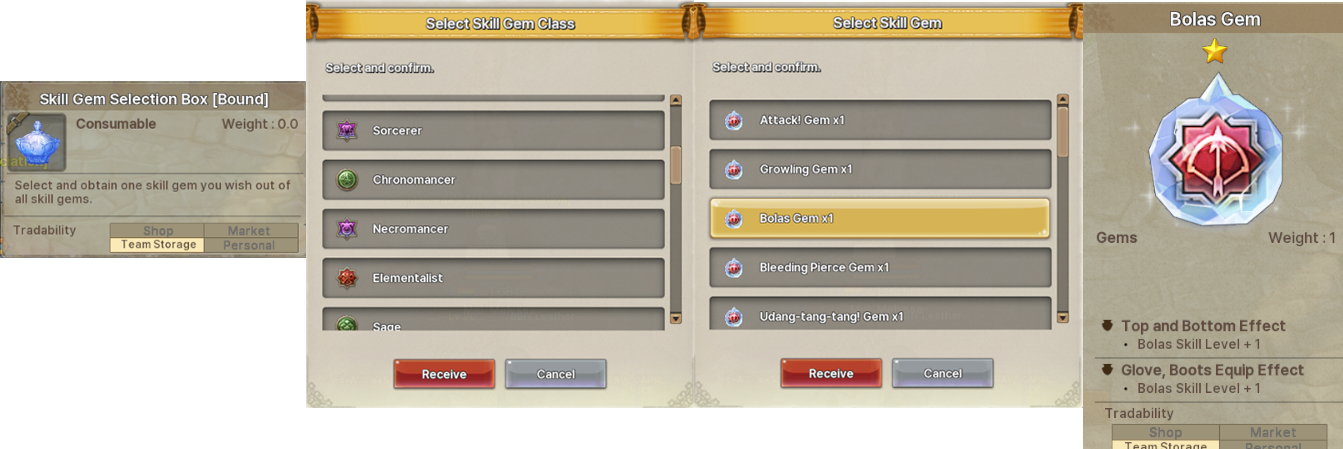 E temos também as gemas sem status. Essas gemas, normalmente conseguimos através de um item que direto recebemos em eventos, login diário e afins, a Skill Gem Selection Box. Com esse item, podemos selecionar a gema que queremos. Mas com dois detalhes fundamentais: Não tem atributos e você pode registrar ela.