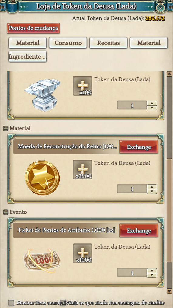 Após consumir todos, vá na loja de Token da Deusa, e compre cerca de 2M de Moedas de Reconstrução do Reino. De preferencia moedas das seasons passadas.